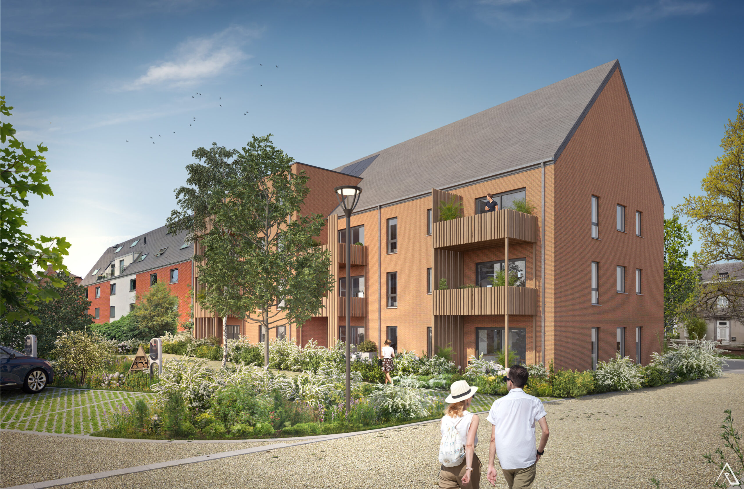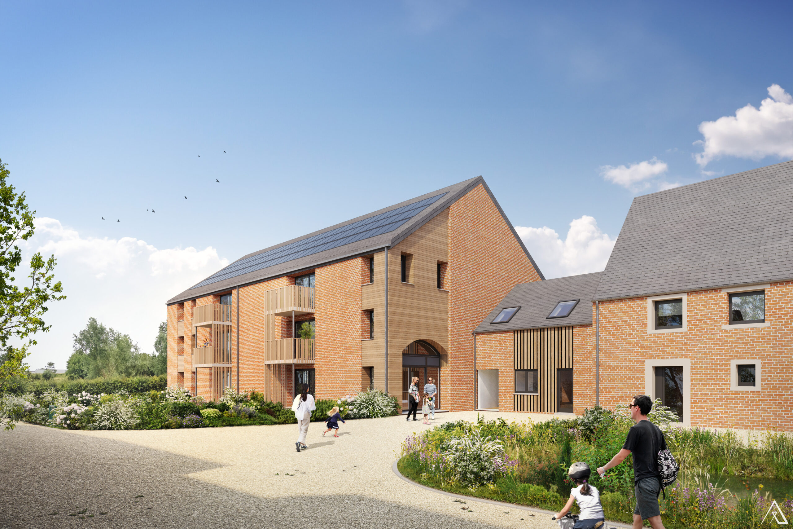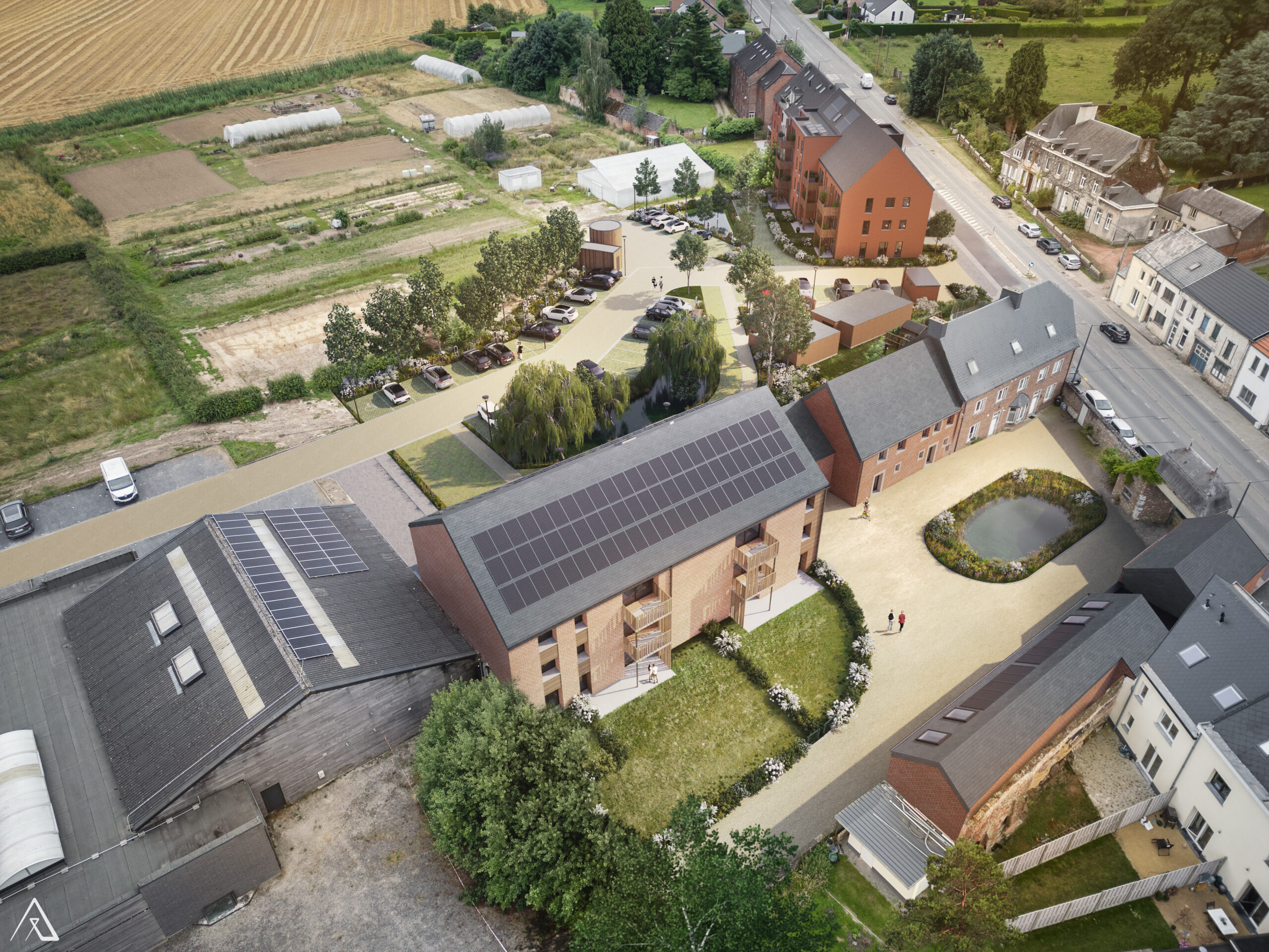 Développement d’un écoquartier comprenant 12 appartements dans une ancienne grange entièrement rénovée, 18 appartements neufs dont 12 appartements à revenus modérés ainsi que 3 logements type duplex/maison dans un ancien corps de logis rénové, et une profession libérale. L’ensemble sera intégré dans une oasis écologique comprenant de multiples essences végétales, sélectionnées par nos soins pour des raisons d’intérêt écologique, d’espaces partagés, de noues et de bassins de temporisation d’eau améliorant la biodiversité du site.